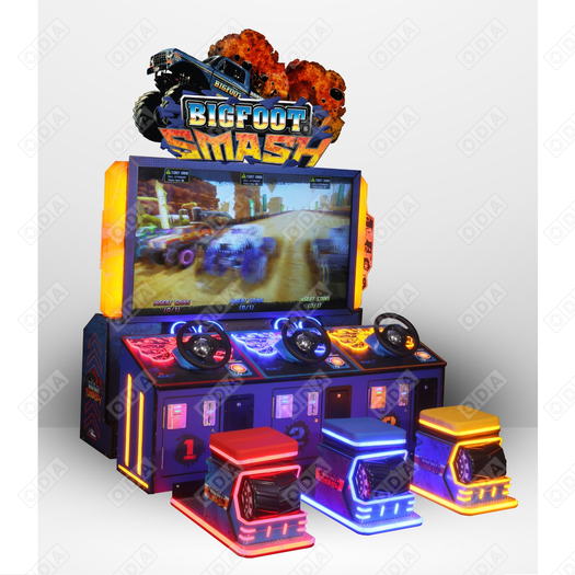Гонки на грузовиках-монстрах. На выбор 6 машин, 4 трассы. Задача прийти первым, собирая заряды энергии и объезжая препятствия. Игрок может присоединиться в любой момент к игре. Монитор 55".